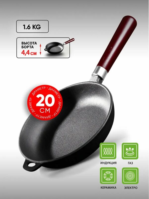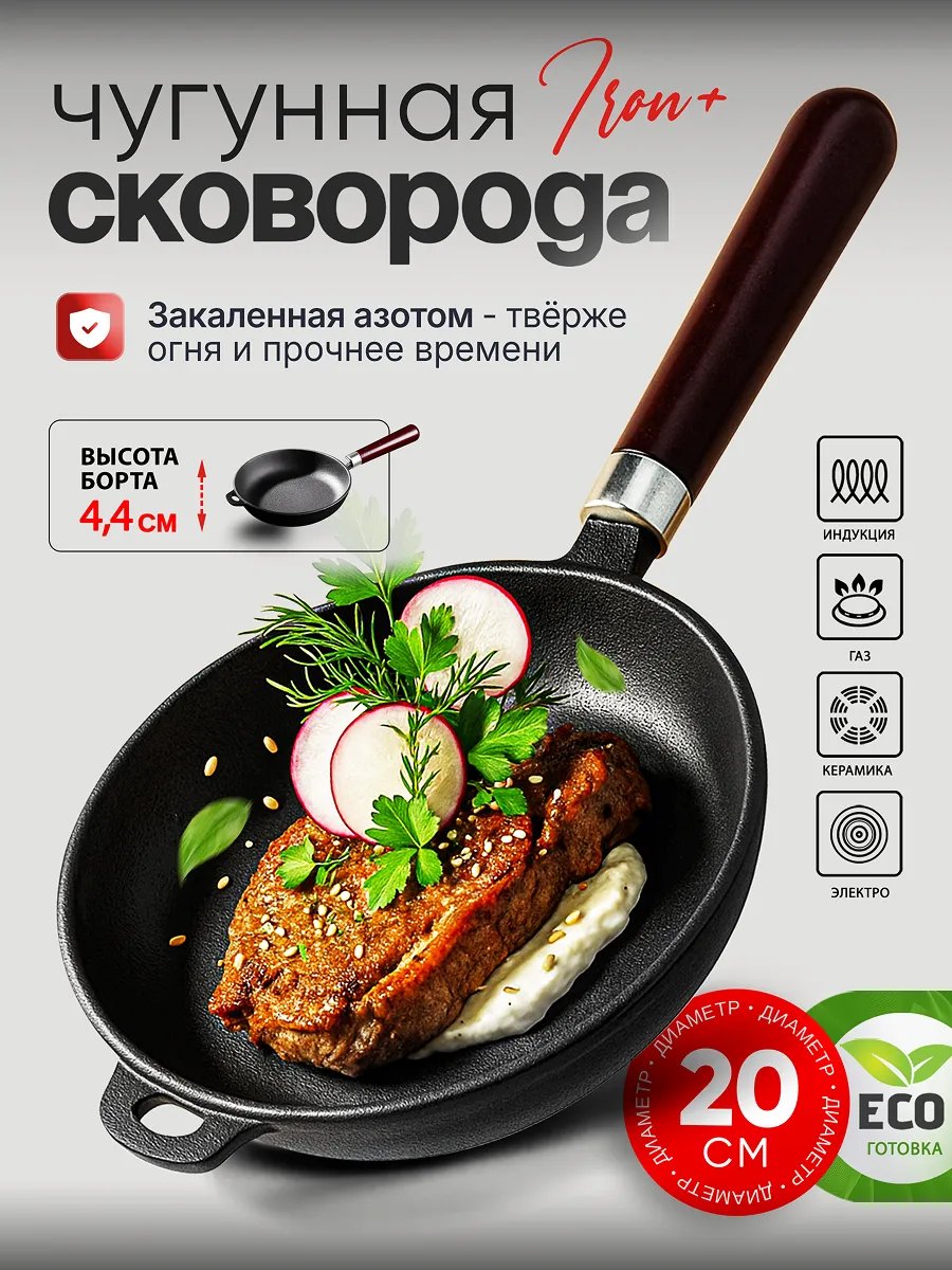 Классическая чугунная сковорода диаметром 20 см с бортиками 4,4 см. Закалка азотом обеспечивает прочность и долговечность, равномерный прогрев делает блюда идеально прожаренными. Подходит для газовых, электрических, индукционных и керамических плит.