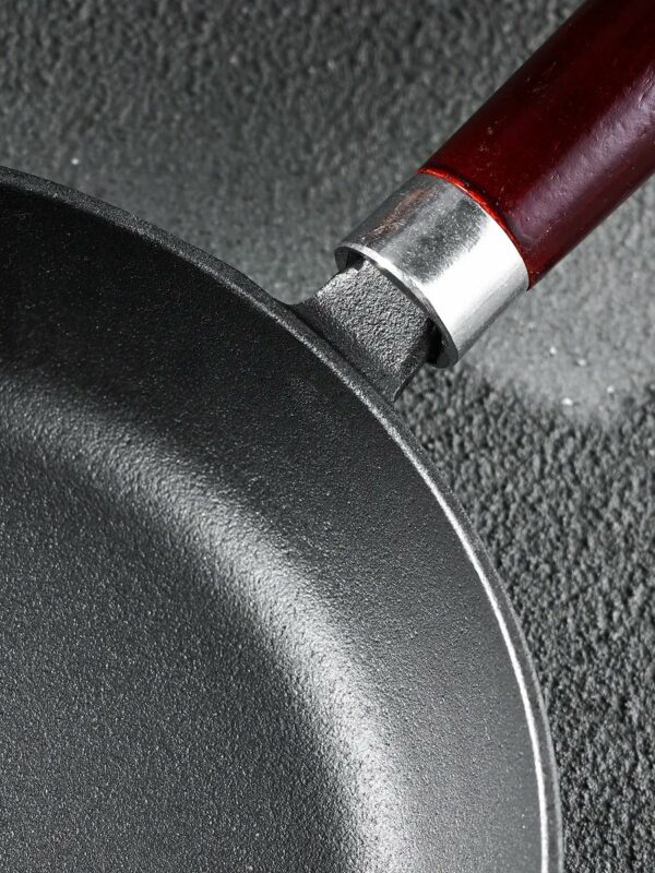 - Натуральное антипригарное покрытие — слой формируется с каждым приготовлением, продукты не прилипают и сохраняют аппетитную корочку.