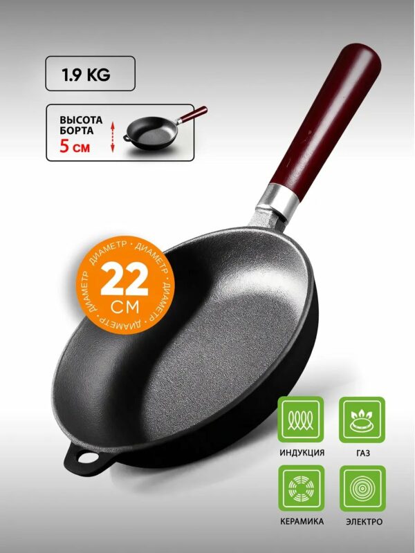 Чугунная сковорода диаметром 22 см с высокими бортами 5 см станет универсальным помощником на кухне. Закалка азотом делает металл твёрже и устойчивее к износу, а значит — эта посуда прослужит десятилетиями.