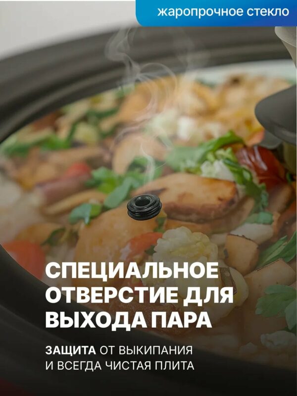 Отверстие для выхода пара предотвращает «убегание» жидкости, соусы и каши томятся спокойно, не разбрызгиваются и не подгорают.