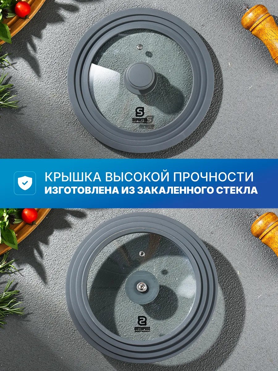 Один аксессуар закрывает сразу несколько диаметров — экономия места в шкафу и меньше лишних вещей. - Прочное закалённое стекло
