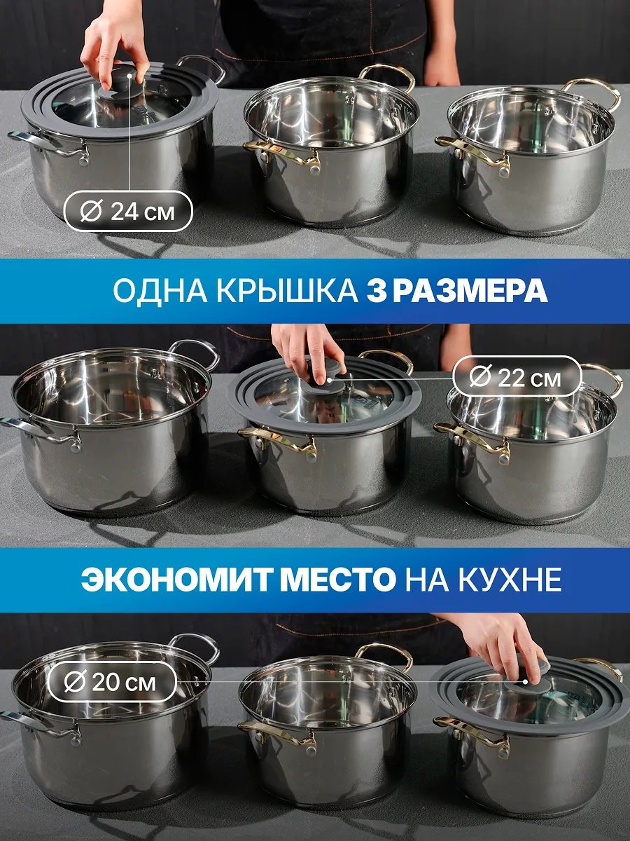 Кухня становится удобнее, когда она оснащена многофункциональной утварью. Универсальная крышка заменяет сразу три отдельные — подходит для посуды диаметром 20, 22 и 24 см. Вместо стопки крышек для разных кастрюль и сковород теперь достаточно одной.