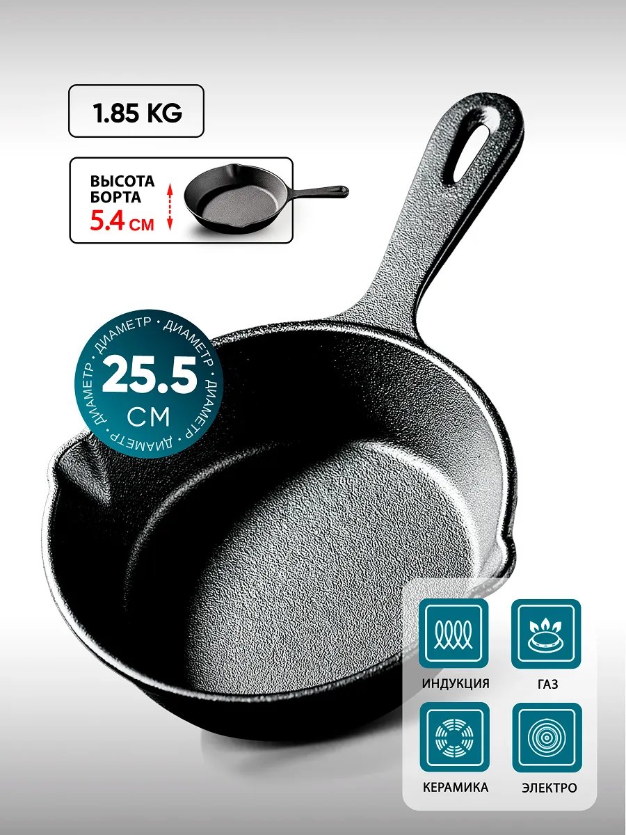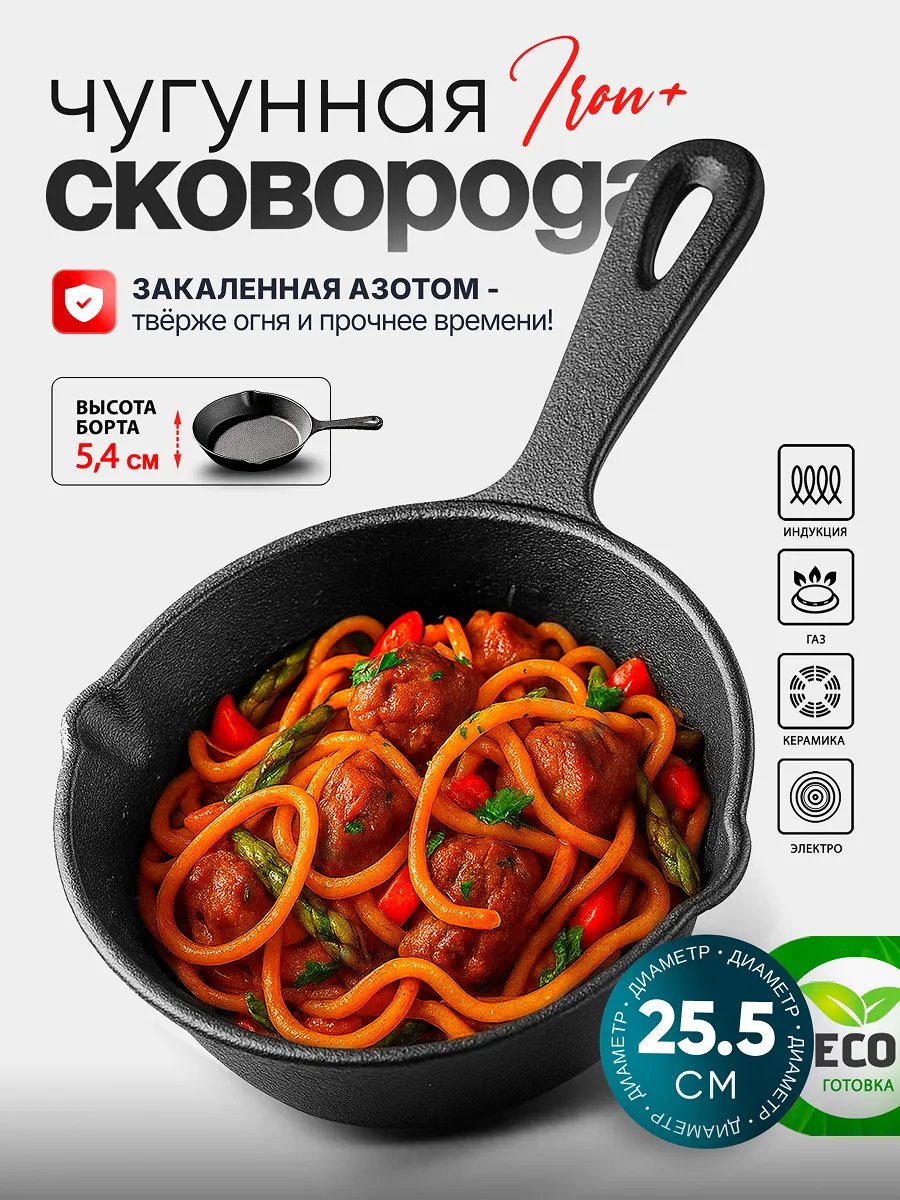 Чугунная сковорода диаметром 25,5 см и бортиком 5,4 см — это универсальная посуда для жарки, тушения и запекания. Закалка азотом делает металл твёрже, устойчивым к коррозии и долговечным. Благодаря равномерному прогреву блюда готовятся одинаково по всей поверхности, а двойные носики для слива масла или соуса делают процесс ещё удобнее. Подходит для всех плит, духовки и открытого огня.