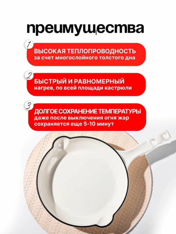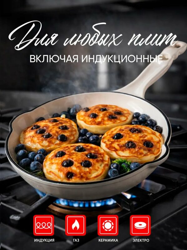 Чугунная сковорода долго сохраняет тепло. Даже после выключения плиты блюдо остаётся горячим и доходит на остаточном жаре. Это удобно, если готовка идёт без спешки или нужно подать еду к столу чуть позже.