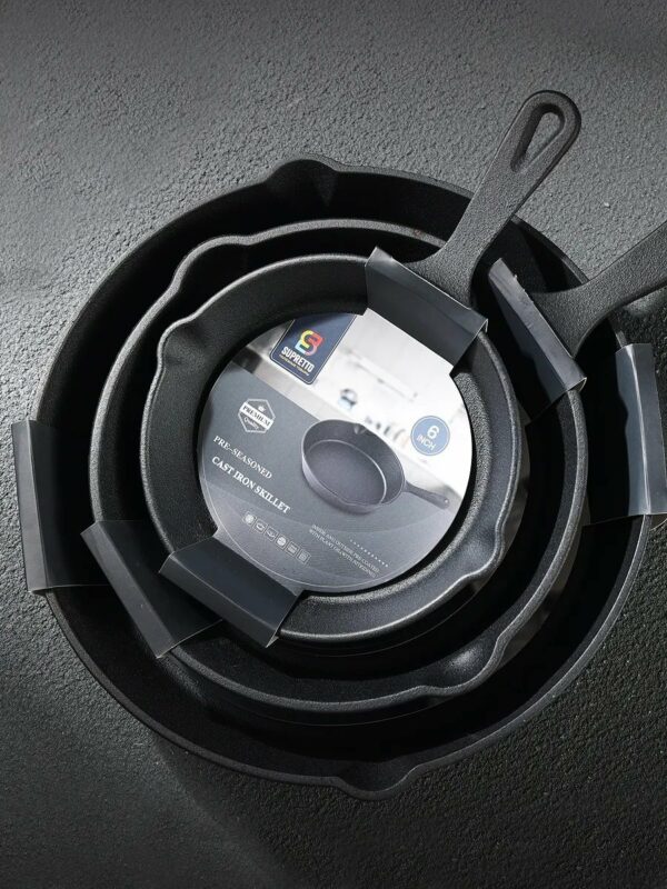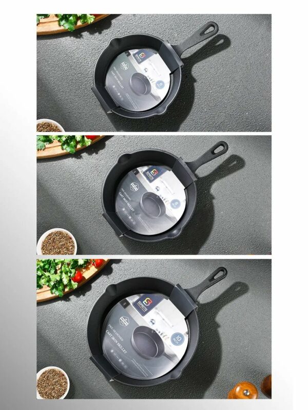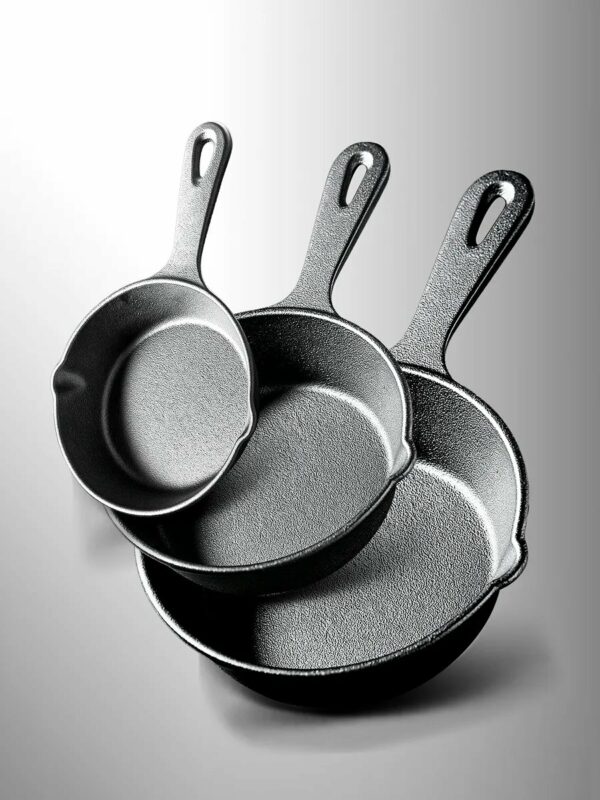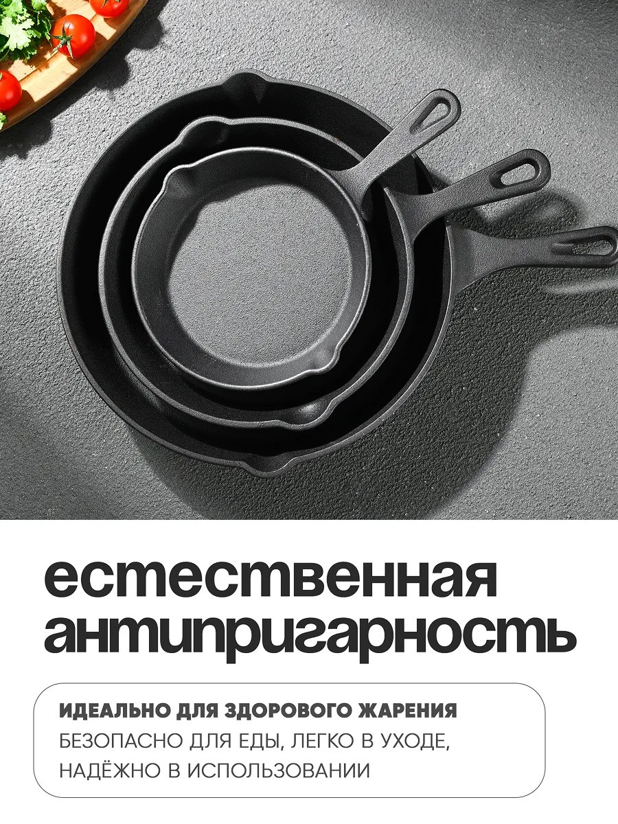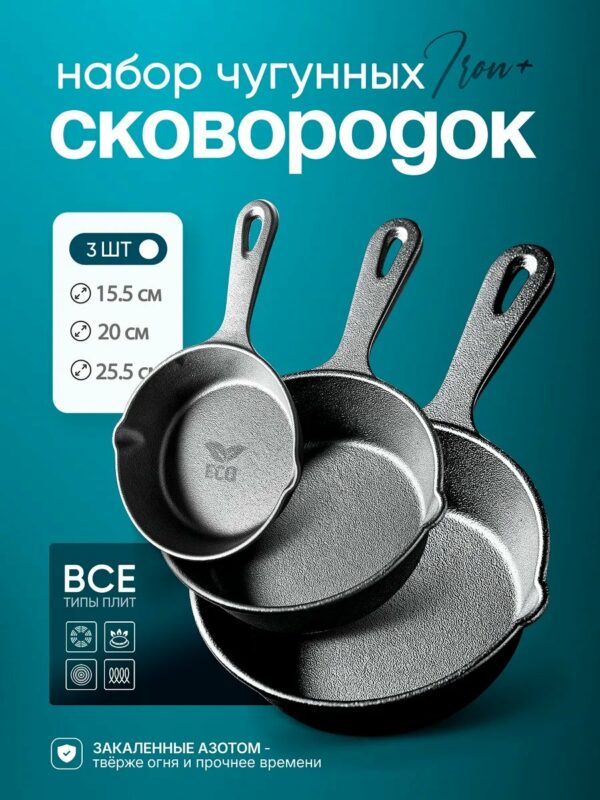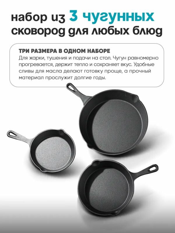Три чугунные сковороды разного диаметра в одном наборе — 15.5, 20 и 25.5 см. Все модели прошли закалку азотом, поэтому стали твёрже, устойчивее к коррозии и долговечнее. Каждая сковорода оснащена двойными носиками для аккуратного слива масла или соуса и подходит для любых плит, духовки и даже костра. Это универсальный комплект, который решает все кулинарные задачи: от завтрака на одного до семейного ужина.