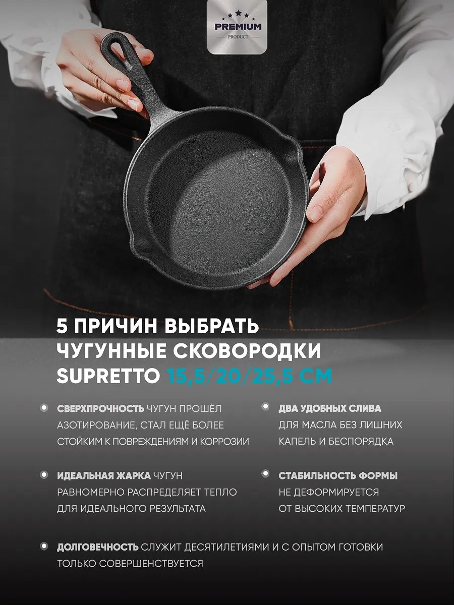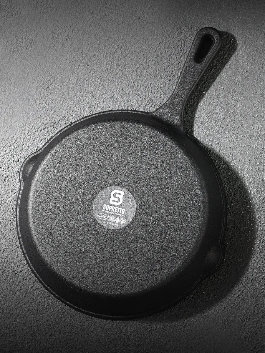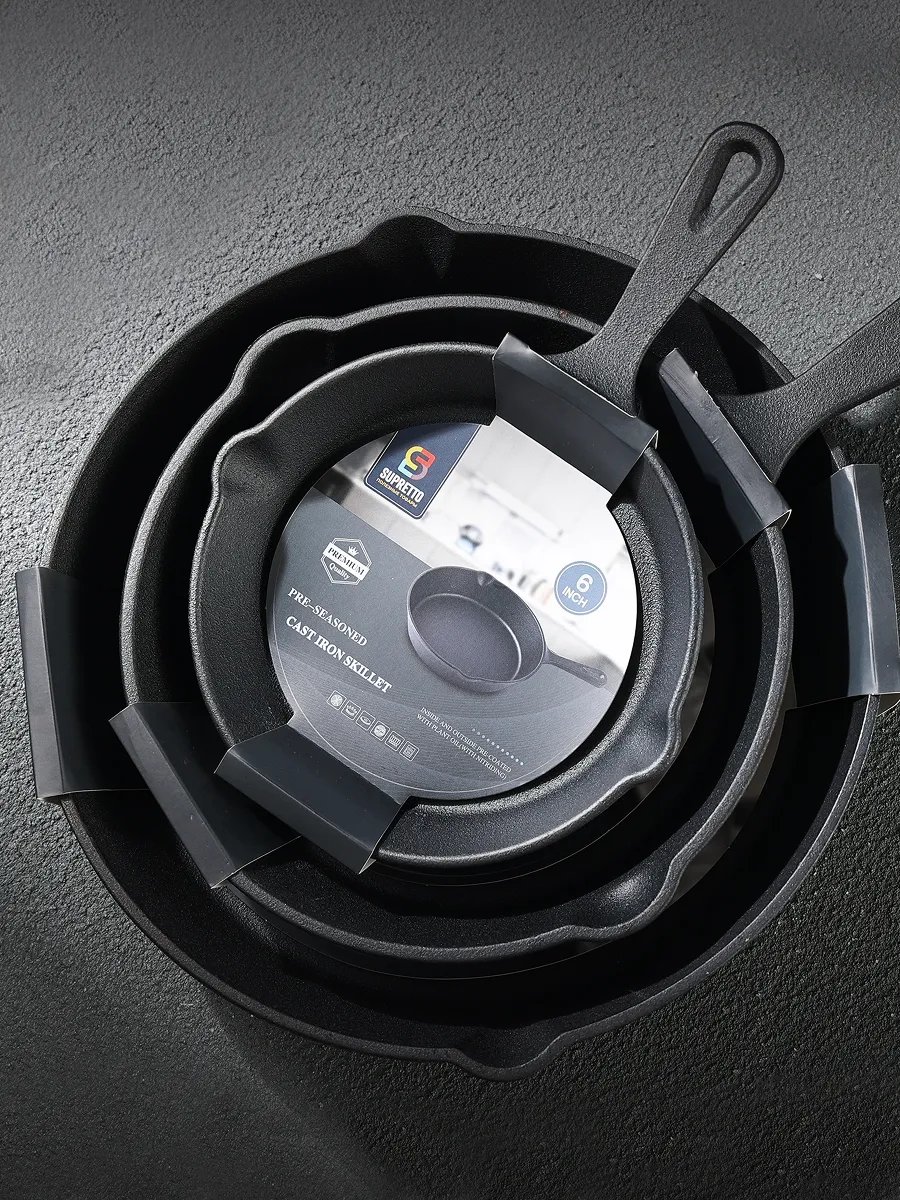 Три чугунные сковороды разного диаметра в одном наборе — 15.5, 20 и 25.5 см. Все модели прошли закалку азотом, поэтому стали твёрже, устойчивее к коррозии и долговечнее. Каждая сковорода оснащена двойными носиками для аккуратного слива масла или соуса и подходит для любых плит, духовки и даже костра. Это универсальный комплект, который решает все кулинарные задачи: от завтрака на одного до семейного ужина.