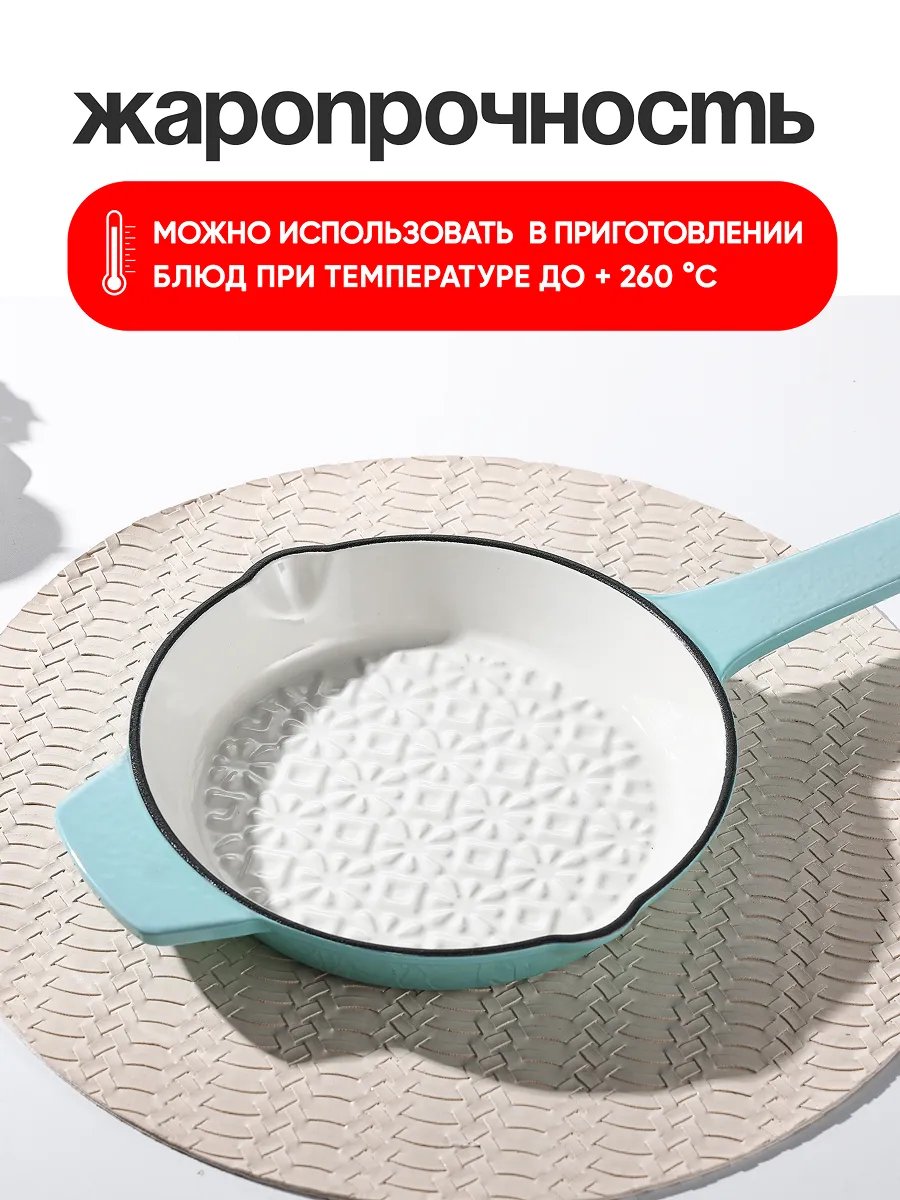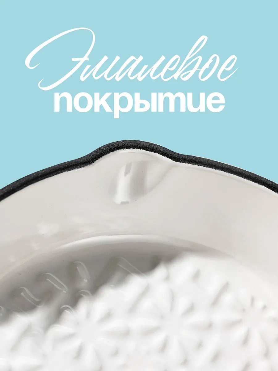 Чугун равномерно прогревается, эмаль защищает поверхность и упрощает уход, а рельефное дно помогает блюдам прожариваться аккуратно и стабильно. Подходит для повседневной кухни, когда важен предсказуемый результат и удобство в использовании.