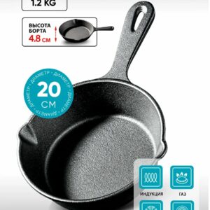 Чугунная сковорода-жаровня (сотейник) – диаметр 20,5 см, борта 3,4 см, две литые чугунные ручки, закалка азотом, натуральная антипригарность, равномерный прогрев, подходит для всех плит, включая индукционные, цельночугунная конструкция. Можно ставить в духовку и даже использовать на открытом огне.