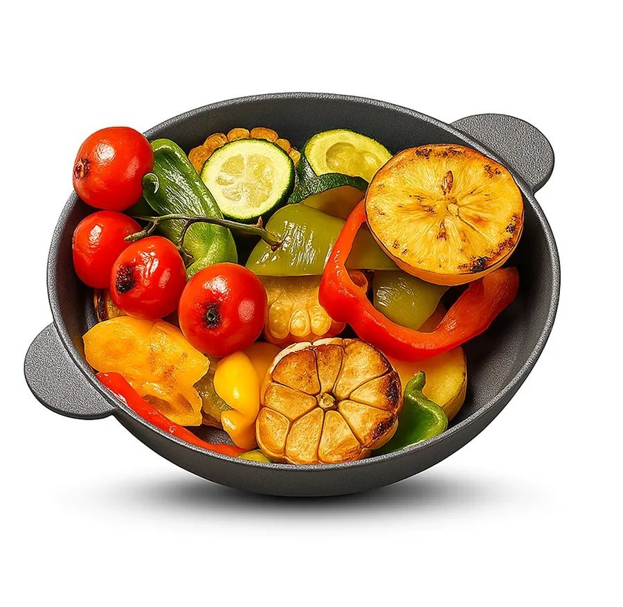 Например, на чугунной жаровне рыба остаётся сочной внутри, а снаружи — ровная карамельная корочка. Всё за счёт быстрого испарения влаги и стабильного жара.