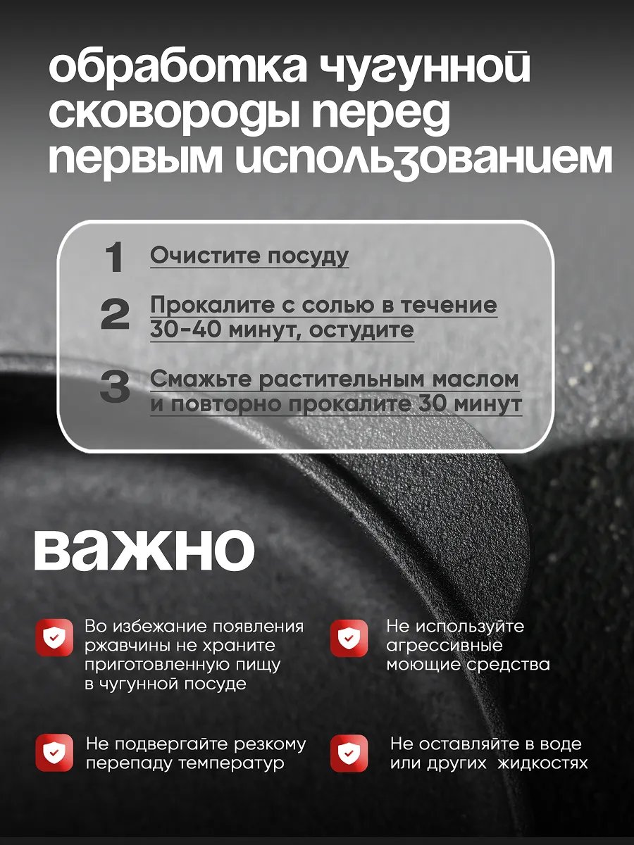 - Перед первым использованием прокалите с солью 30–40 мин, остудите, смажьте маслом и прогрейте ещё раз.